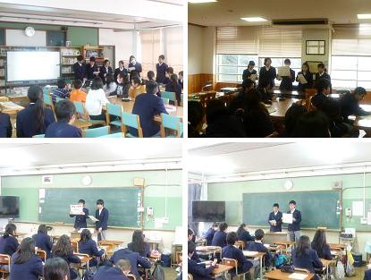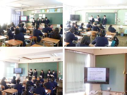 2年生は5限、グループごとに「生き方探究・チャレンジ体験」の発表会をおこないました。グループによって、パワーポイントを使ったり画用紙にまとめたりと形式は違いましたが、がんばって体験を通して感じたことや学んだことを発表していました。発表するのに声が小さかった人が多かったことが少し残念でした。