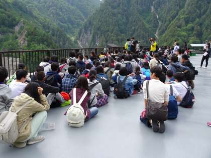 トロリーバスに乗り込み,黒部ダム駅に到着しました。これから,クラスごとに黒部ダム学習プログラムを受けます。