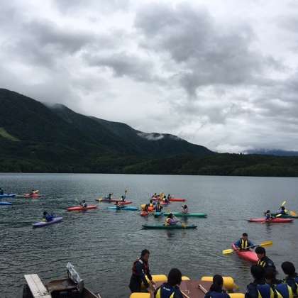 お天気も回復,いざ,青木湖へカヌー体験!!みんな上手に漕いでいます!!