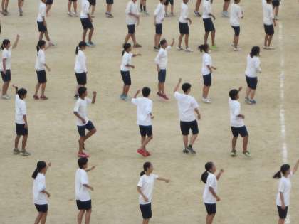 洛中の生徒たちの勢いが天気予報を覆したのでしょうか。放課後の各色の取り組みも実施ができました。写真は,赤組の集団演技と黄組の展示パネル製作の様子です。真剣そのものです。