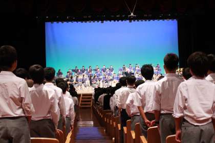 学校祭1日目,神山ホールのフィナーレは,ブラスバンドの演奏で『翼をください』の全員合唱でした。舞台とフロアーが一つになった素晴らしい発表となりました。ブラスバンドの演奏で全校生徒が合唱できるという貴重な体験は,生徒一人一人の心に感動を呼び起こしました。明日に,そして体育祭につながる元気の源にもなりました。