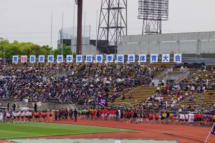 スタンドから撮影していただいた春季総合体育大会の開会式の様子を紹介します。元気良い掛け声と共に笑顔いっぱいの行進が印象的です。正々堂々笑顔いっぱいの爽やかなプレーを期待しています。