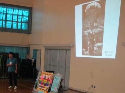 前半は武道場で集会隊形になって長崎に原子爆弾が投下され,生き残った人たちのその後を知り,「平和とは何か」という問いかけをしてその後クラスに戻って一人一人考えました。