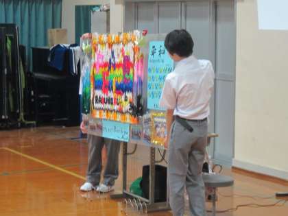 また,事前学習の最後にこれまで1か月かけて係りの生徒が作ってくれた千羽鶴アートのお披露目会をしました。