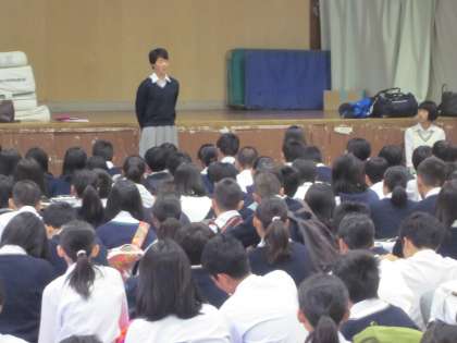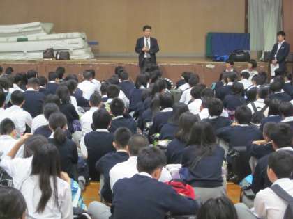 午前6時,早朝にもかかわらず,さわやかな顔で登校してきた3年生,武道場で出発式が行われました。校長先生と修学旅行委員長さんの願いを込めたあいさつ,そして,3日間お世話になる添乗員さんと写真屋さんの元気いっぱいのあいさつもありました。全員が,「素晴らしい修学旅行にするぞ」という思いを共有できる出発式となりました。