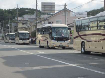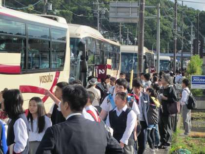 バス6台に分乗して京都駅に向けてスタートです。早朝にもかかわらず保護者の皆さんや先生方のお見送りの中,バスは予定通り出発しました。