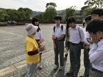 原爆の体験をされたり,原爆の体験をされ方から直接学ばれた「さるくガイド」さんのお話に耳を傾ける様子です。長崎原爆資料館での学習も予定されています。