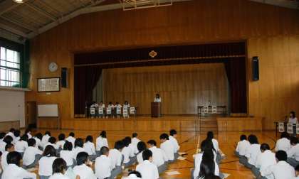 11日(木)、生徒会執行部主催の生徒大会を開催しました。この生徒大会は、年間の生徒会活動や普段の学校生活についてみんなが自分の意見を出し話合う場です。生徒会副会長の開会宣言でスタートし、生徒会長をはじめ環境、保健、体育、図書の各委員長が、年間計画などを発表しました。各クラスからは建設的な意見が出て、活発な議論が展開されました。例えば、「アルミ缶の回収で得た資金の奨学金で、タイの人が学校に行けるようになっているから、回収強化期間を設けては !」、「体育祭では個人競技より集団での取組をもっと増やそう!」などです。採決ではほぼ全員が賛成し、洛東中生の前向きさが全面に出た、とても活発な生徒大会になりました。