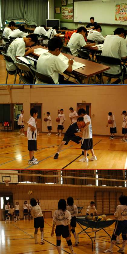 暑い中,涼しい部屋で学習会を行い,その後に練習で汗を流している部活動。まさに「文武両道」の姿があります。