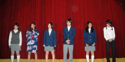 英語技能検定準2級合格者2名をはじめ、これから検定を受ける生徒などで、得意の英会話力で、この前に亡くなったマイケル・ジャクソンが手がけた"We are  the World"の歌ができあがるまでの過程を、すばらしい発音とイントネーションで語りました。1・2年生にもめざす目標となる英会話力を聴かせました。