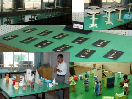 授業で製作している「ミニテーブル」や「キーホルダー」。夏休みの課題として製作した個人作品を展示。