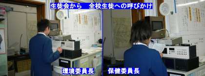 4日(金)、校内放送で全校生徒に向けて、環境委員長が「エコタイム」を、保健委員長が「風邪に負けるな ! キャンペーン」を呼びかけました。