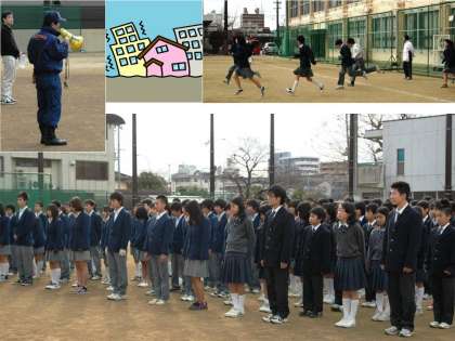 15日(金)、15年前の阪神・淡路大震災での教訓を思い起こすために、東山消防署のご指導で地震を想定した避難訓練をしました。「校舎西側の出入り口と保健室が倒壊し、負傷した養護の先生を初期救護班の先生が救出して担架で搬出する」という想定での訓練です。