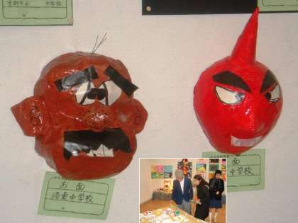 日頃の学習の成果を発表するために、二人が丹精込めて製作したお面です。展示会場ではひときわ目につく作品として輝いていました。