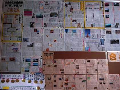 2年生が5月18日からの修学旅行に向けて、事前学習として調べたことを壁新聞にまとめました。貼り出された壁新聞を全先生方が審査し、すばらしいと思う作品に金色のシールを貼っています。今日(26日)現在では、最大8枚のシールが貼られている作品があります。