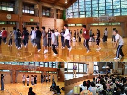 写真上は、プレーホールでのレクレーションの様子です。あいにくの天気ですが、代議員会が企画した大縄飛びなどで仲良く交流しています。