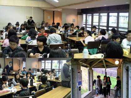 写真下は、みんなと楽しく教室でお弁当を食べています。また、休み時間には、宿泊棟につながる渡り廊下などで和やかに談笑をしている様子が見られ、花背の新鮮な空気を満喫しています。