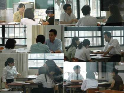 懇談会の資料は、1・2年生は普段の学習状況や5科テスト、中間テストの結果をもとにした仮評定を、また、3年生は1年生、2年生の学年末の成績も加えた資料をもとに、進路選択に向けた懇談です。