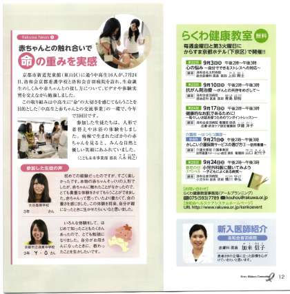 京都市新道児童館で日頃から学童の指導補助をしている中高生16人が、7月末に洛和会音羽病院で赤ちゃんとの接し方や生命誕生のしくみなどについて勉強しました。その時の様子と3年生のYOさんの感想が、「おとまるクン」という洛和会さん発行の機関誌に掲載されましたので紹介します。