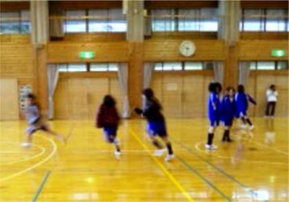 活動3は「スポーツ」 弥栄中の体育館とは,天井の高さも広さも大違いの場所で,鬼ごっこなどに興じました。