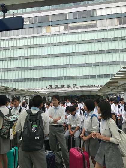 新横浜到着です。各クラス、バスレクを楽しみながら、ソレイユの丘を目指します。