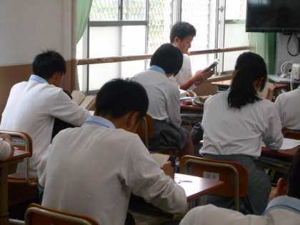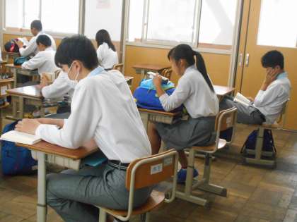 3年4組の読書の様子です。チャイムの前から本に向き合う人もいます。30分になったら話し声が止み自然と読書に入れてます。