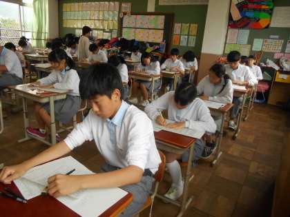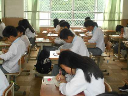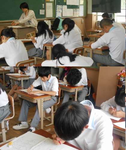 国語は聞き取りが最初にあります。問題文が配られる前、生徒たちはメモをしっかり取ってます。