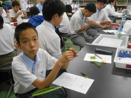 葉っぱをはがした布を,鉄・アルミなどの水溶液に浸けておきます。