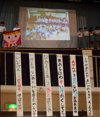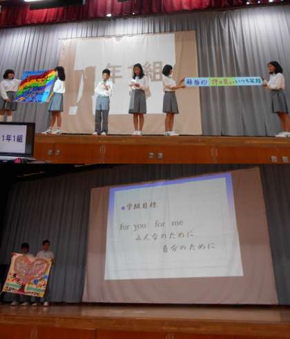 1年勢の発表と,いじめ追放のクラス標語です。