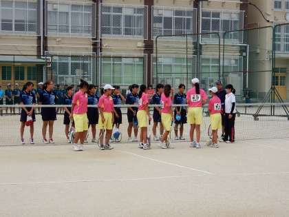三年生にとっては最後の大会。女子テニス部団体戦が7月23日、加茂川中学校で13時から行われました。1回戦は上京中学校と対戦です。各校とも熱の入った応援なか、試合がスタートしました。