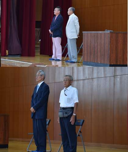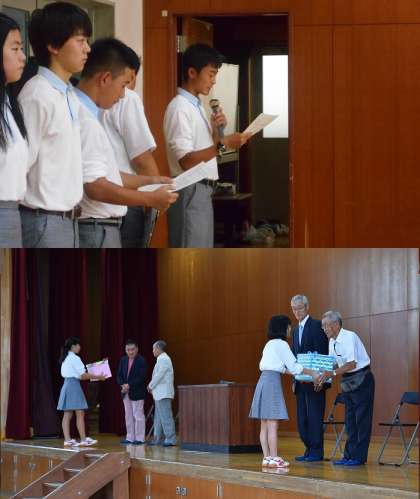 今年も山階南学区、百々学区の自治連合会と老人会の代表の方にお越し頂き、生徒からのメッセージとコルクコースターをお渡ししました。