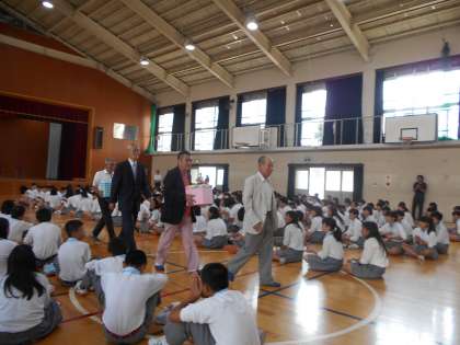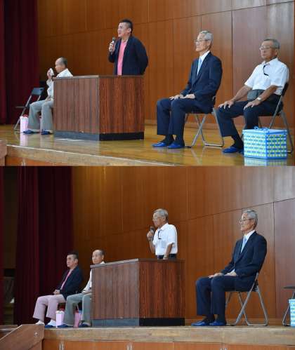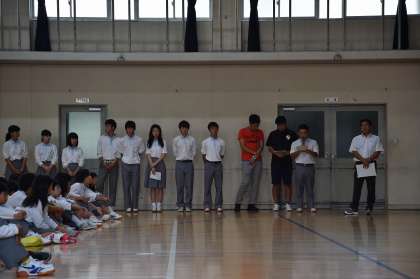 生徒会が交流会の歴史や手紙・コースターの説明などをしてくれ、お返しに自治連合会長、老人会会長様より子どもたちへのメッセージを頂きました。