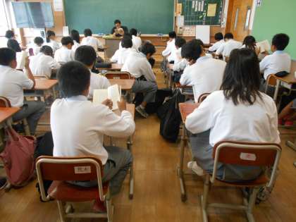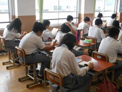 1年2組の読書の様子です。ほとんどの生徒が、8時30分から先生と一緒にしっかり読めています。