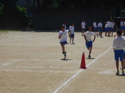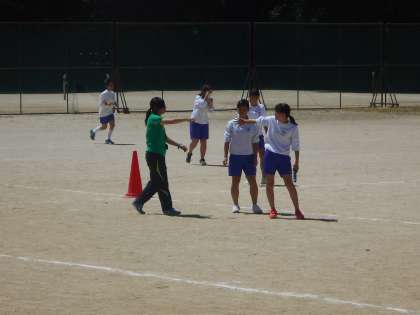 体育では陸上競技です。今日はバトンの練習をしています。