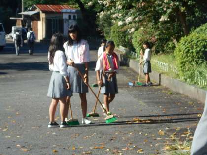 桜の葉が散る季節になってきました。落ち葉掃きは陸上部が頑張ってくれています。