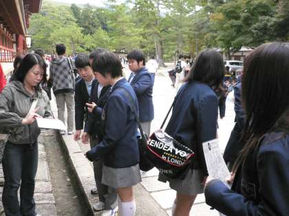 ウオークラリーについても、ほとんどの班が全員で男女協力して行動できました。東大寺付近では、ゴミ箱からエサをあさっている鹿がいましたが、ナイロン袋を食べさせないようにとゴミ箱の底にゴミを押し込んでくれていた人や、若草山では、ゴミを出さないどころか、周囲のゴミを回収してくれた人もいました。大変うれしく思いました。 今回の校外学習を通して、またひとつみんなは成長できたと思います。今回の経験を今後の学校生活に生かして欲しいと思います。