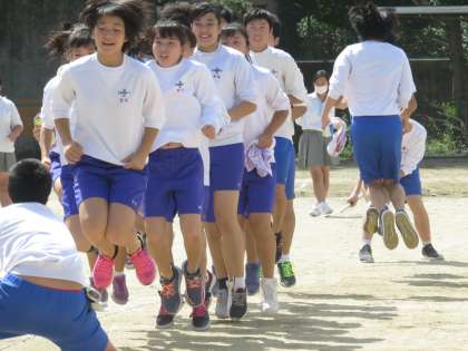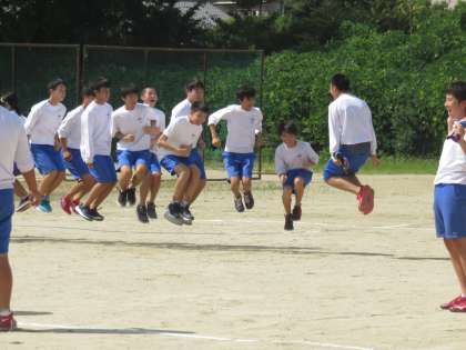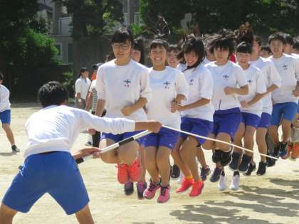 学年練習の時間の最後は大縄の練習です。現在までの最高記録は2組の44回だそうです。頑張れ、他の6クラス!!