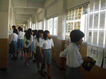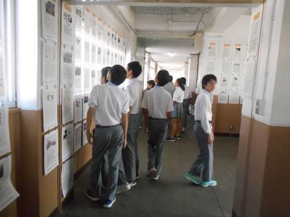 2年生の展示鑑賞のようすです。やはり自分たちの作品が多い2階が人気です。
