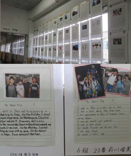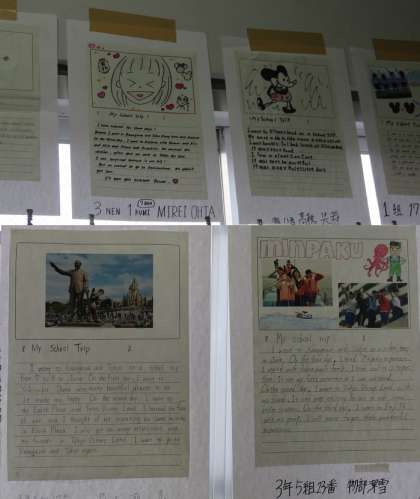 テーマは「My school trip」でそれぞれの修学旅行の思い出を絵と英語の文章で表しています。