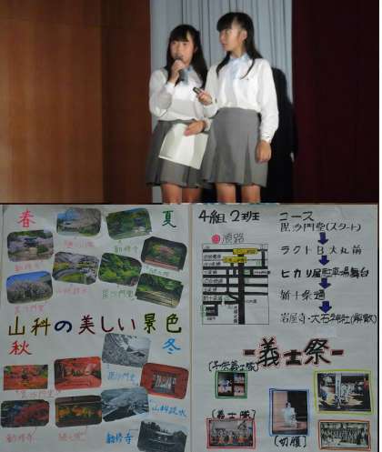 2年生はふるさと山科について調べ学習を行いました。ステージでは各クラスで代表に選ばれたグループが発表します。