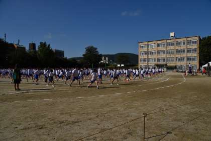 続いて大会実行委員長の亀井先生から諸注意があり、藤岡君の号令で準備体操をしました。さぁ、いよいよ競技の開始です。