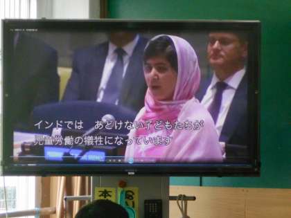 1年4組の道徳のようすです。今日はマララさん(マララ=ユスフザイ)を取り上げました。