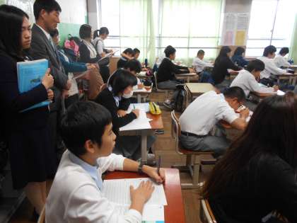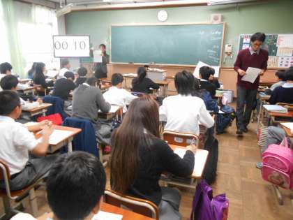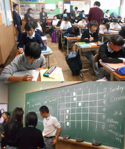 英語は1年1組です。テーマは「英語でものがどこにあるかを聞くこと、読むこと」です。後半は班ごとに協力して大きな声で練習をします。