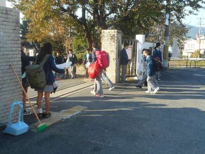 落ち葉が増えてきましたが、陸上部が校門付近を掃いてくれています。