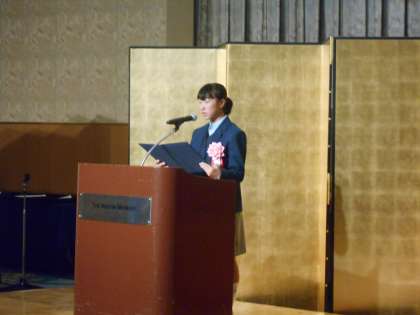 写真は先日ウェスティン都ホテルで開かれた表彰式で、伴さんが作文を朗読したときのものです。