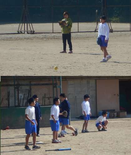 1年生はグラウンドでソフトボールの授業です。