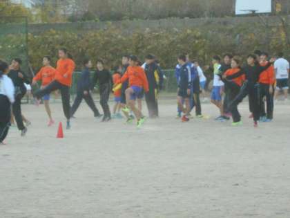 グラウンドでトレーニングの陸上部と山科川の堤防を走る女子バスケットボール部です。