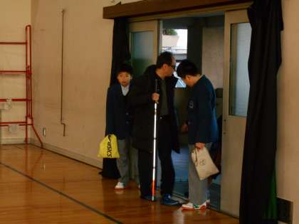 1年生は全盲の障害を持つ松永信也さんを講師に迎えて、体育館で学習を行いました。