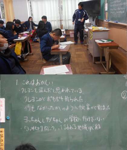 3年4組と1組の学習のようすです。