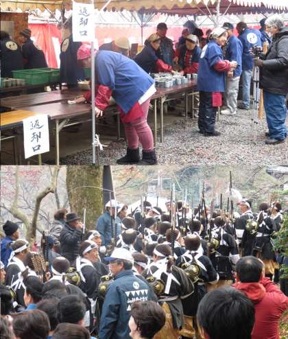 行列の最後は岩屋寺で、百々学区の社会福祉協議会などから、甘酒が振る舞われ、大石神社で宮司さんからお祓いを受け、勝ち鬨を上げます。